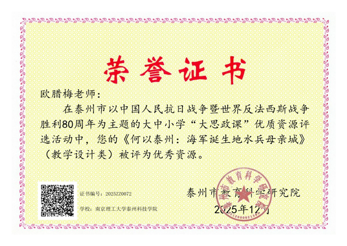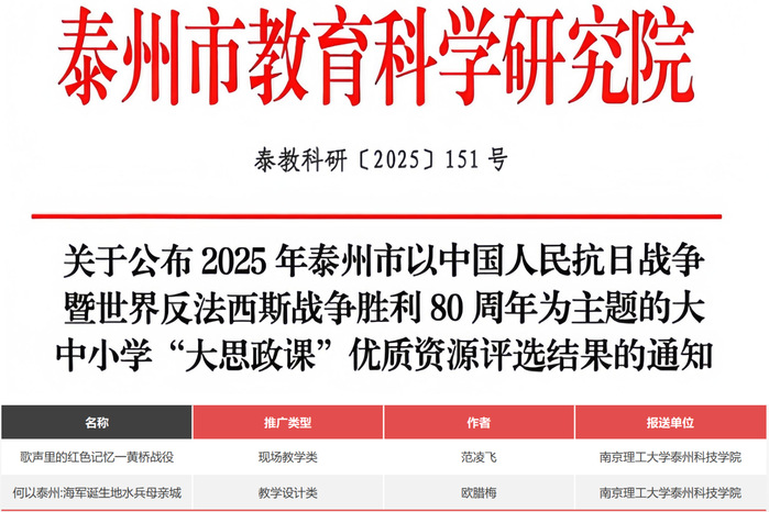 近日,泰州市教育科學(xué)研究院公布2025年泰州市以中國(guó)人民抗日戰(zhàn)爭(zhēng)暨世界反法西斯戰(zhàn)爭(zhēng)勝利80周年為主題的大中小學(xué)“大思政課”優(yōu)質(zhì)資源評(píng)選結(jié)果,我校報(bào)送的兩項(xiàng)作品分獲泰州市大中小學(xué)“大思政課”精品資源與優(yōu)秀資源,充分展示了我校教師教學(xué)創(chuàng)新能力,彰顯了學(xué)校思政教育改革成效。